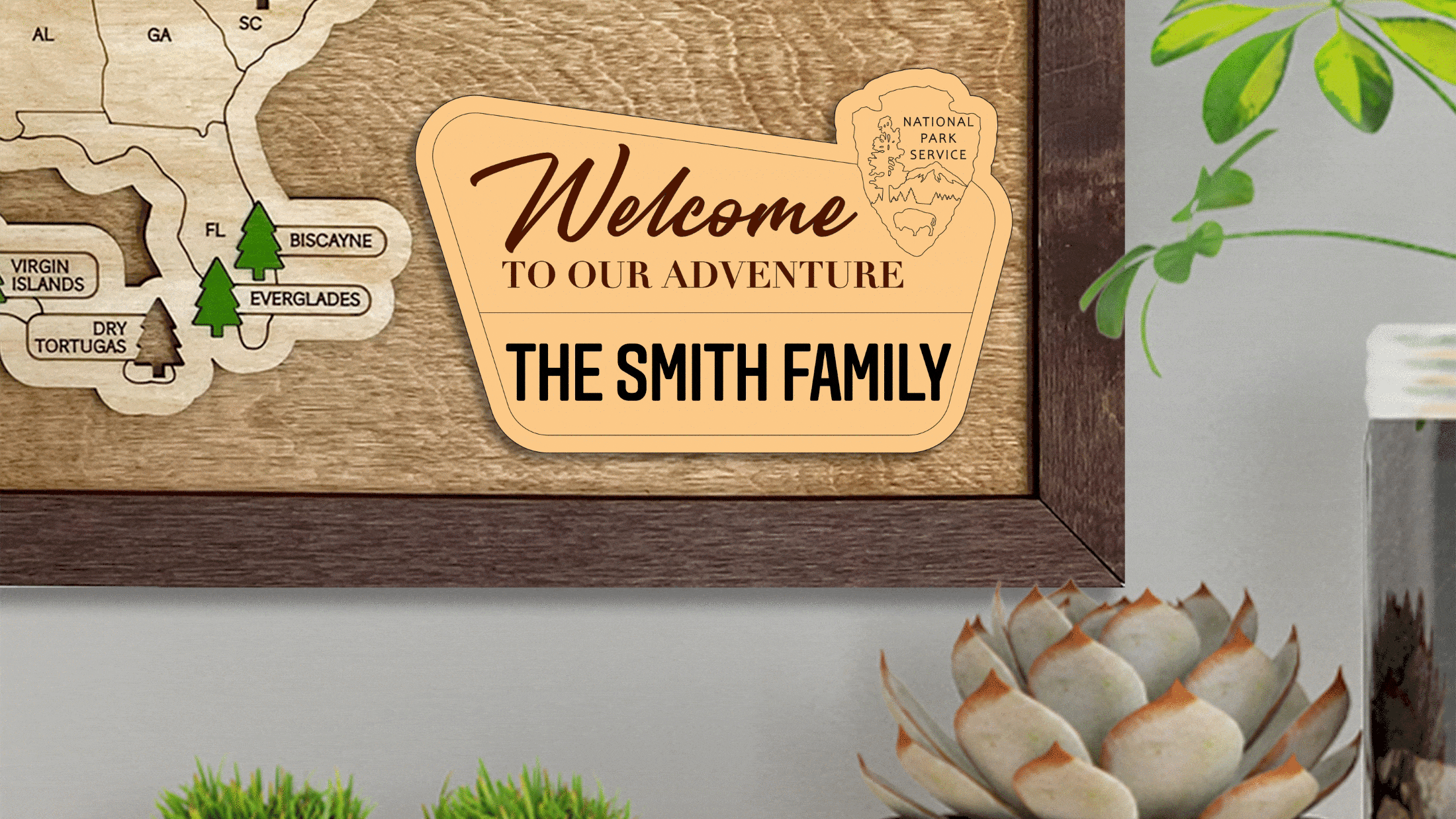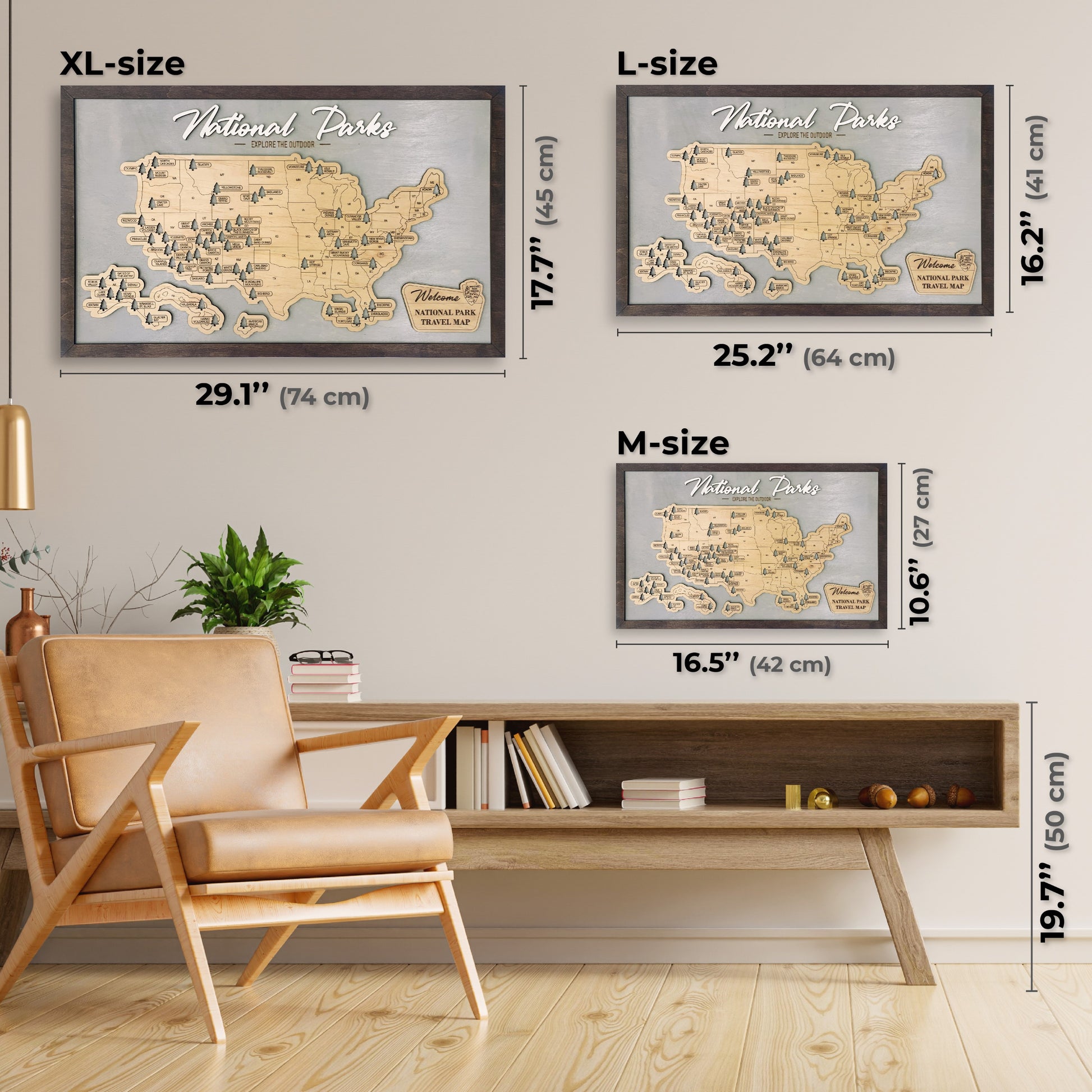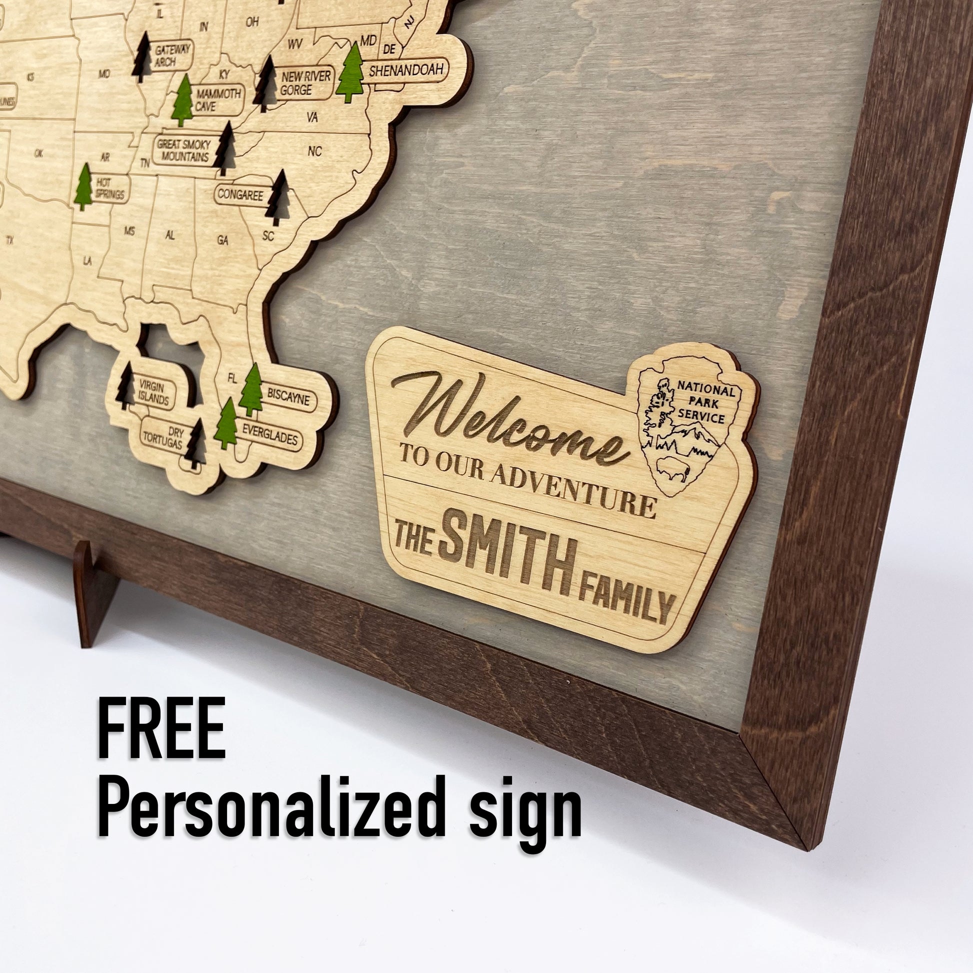 The set comes with a special easel to place the map on your table and 70 tree-tags to mark the national parks you’ve visited.