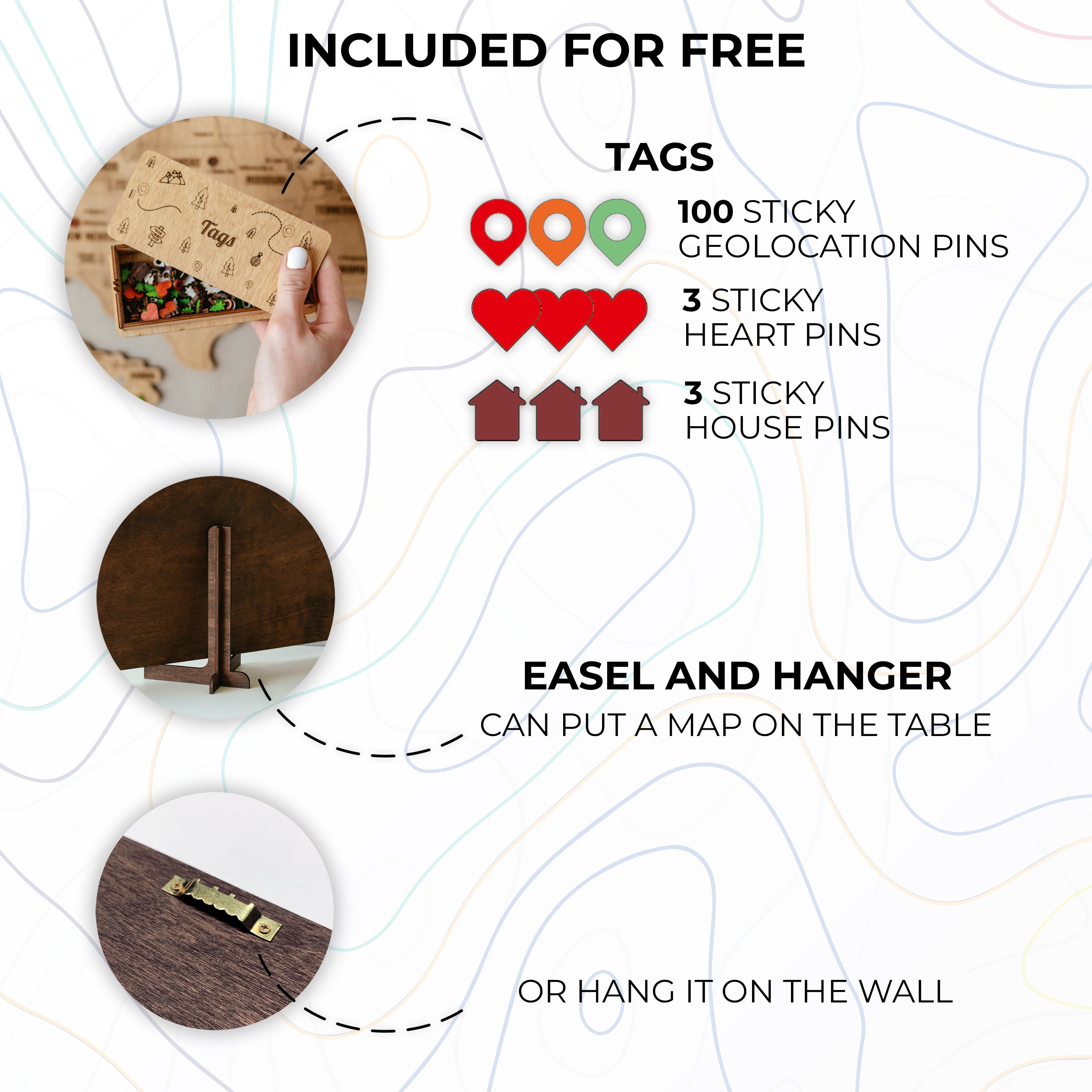 The set includes a special easel to put the map on the table and a hanger to hang on the wall.